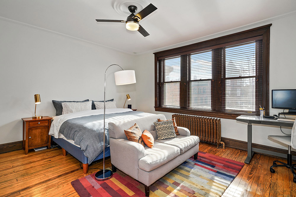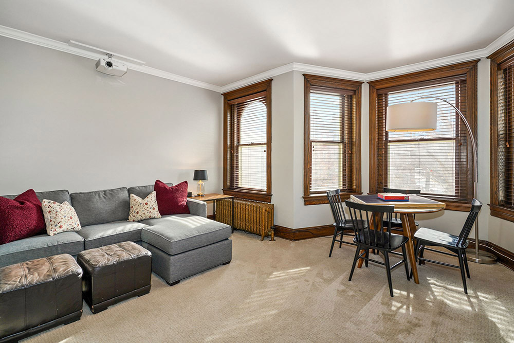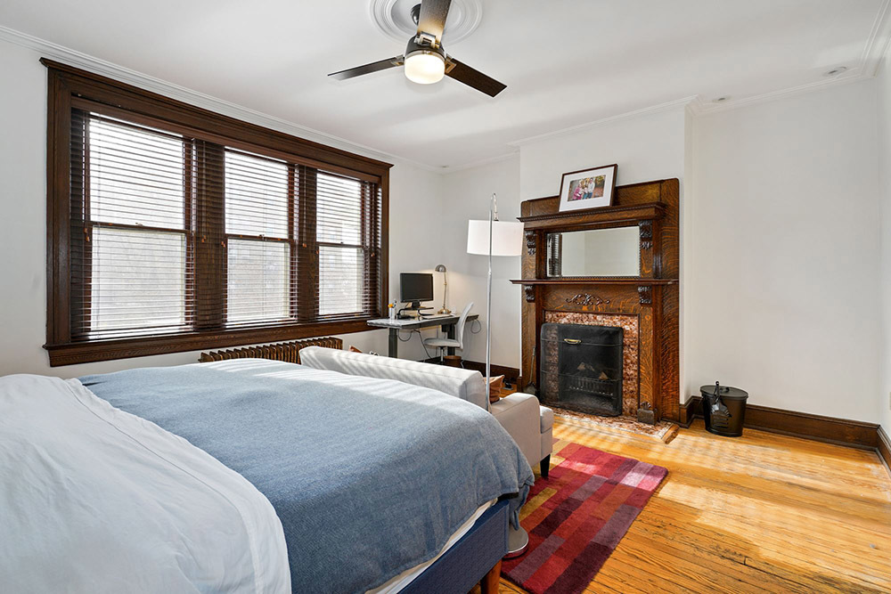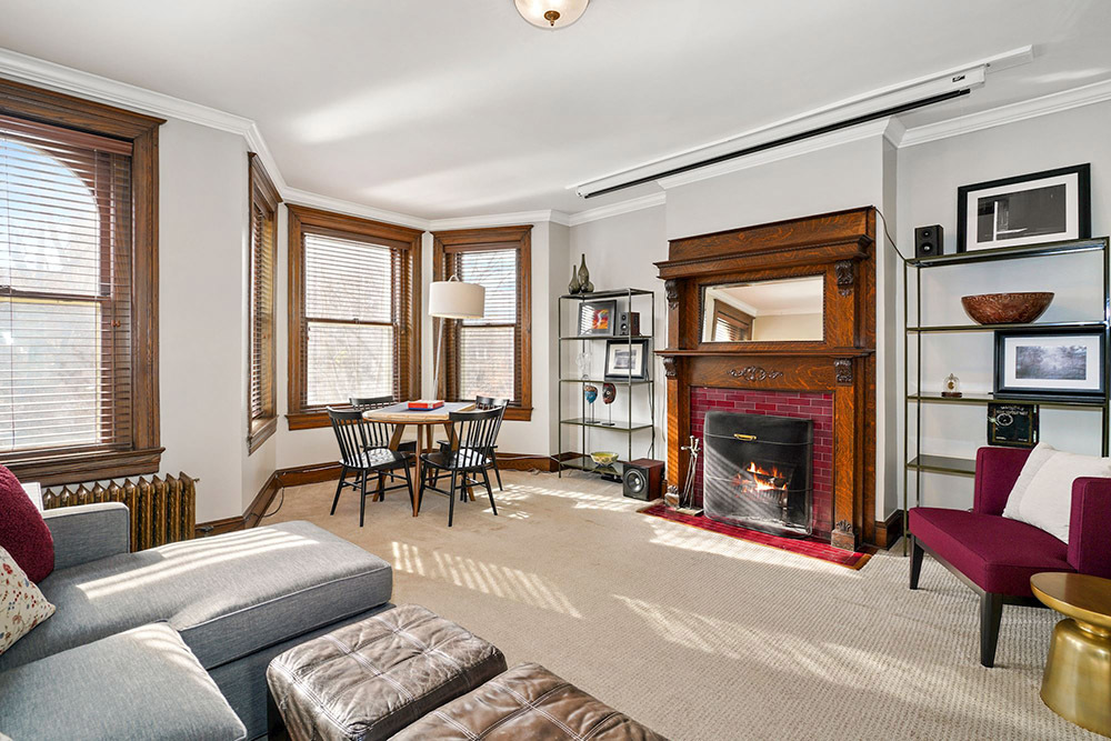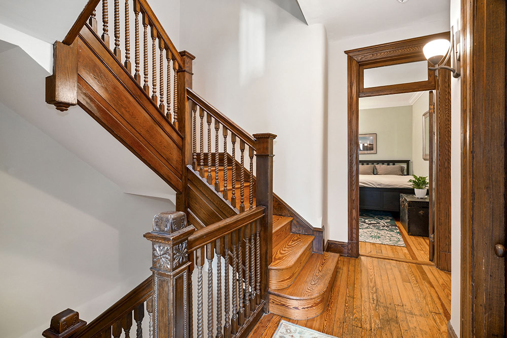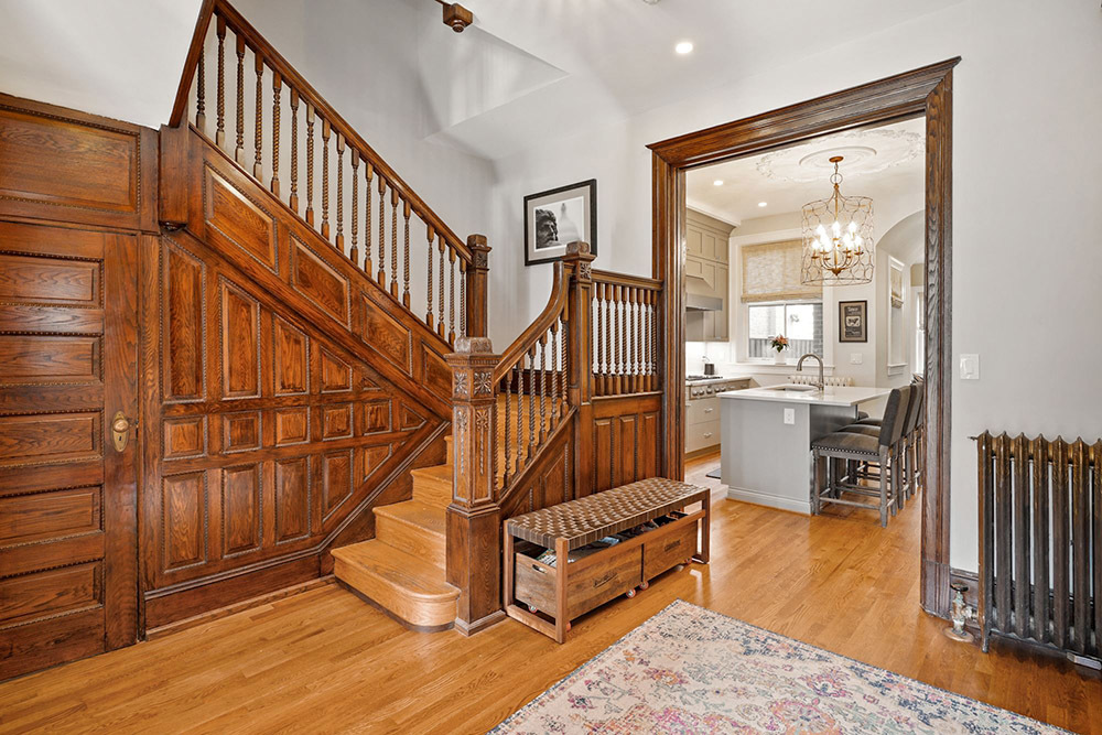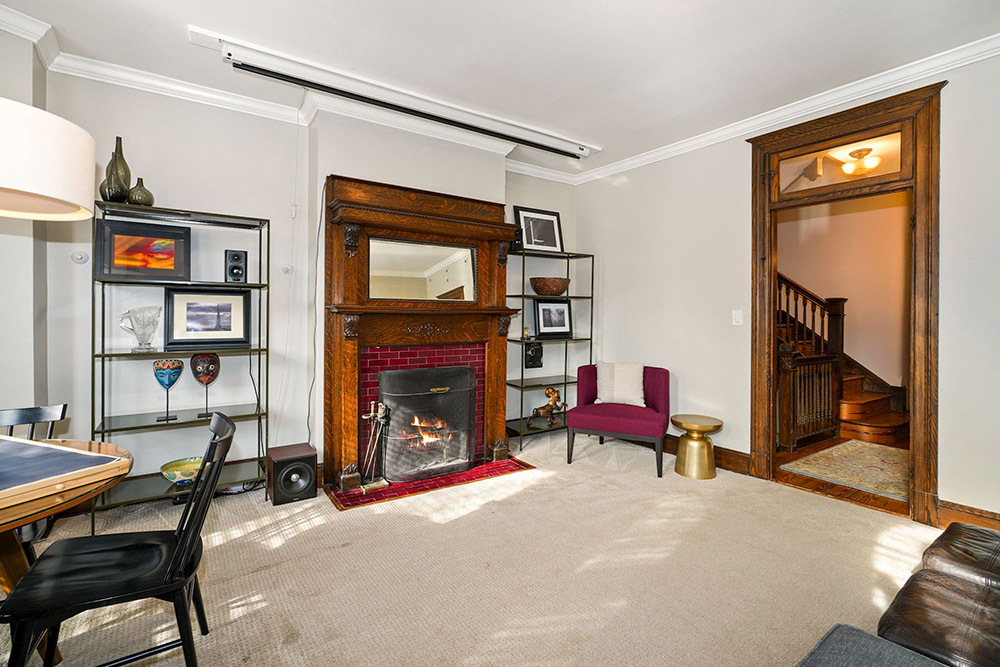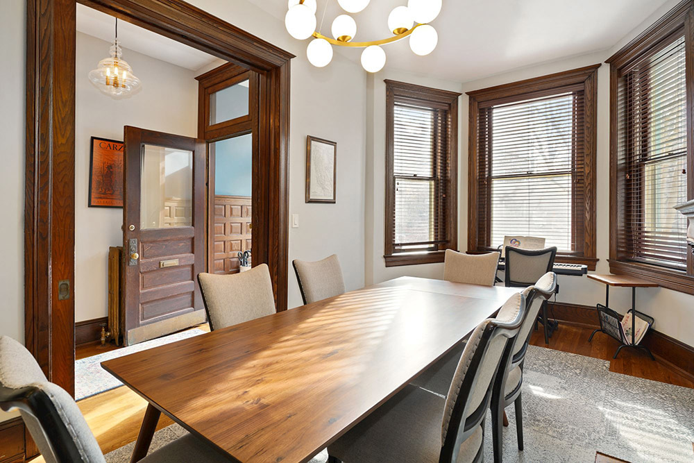 From the front foyer, you’ll immediately sense the authentic tone of the home. Classic millwork, paneling and built-ins have been lovingly preserved, including leather capped railings on a memorable staircase. Vintage strip hardwood floors exude a cozy glow. Luxurious modernity also has its place, coexisting in perfect harmony throughout. Touring the main living level, you’ll first discover a lovely front dining room with triple bay windows and elegant fireplace.