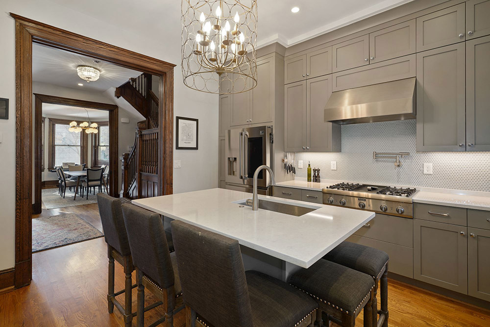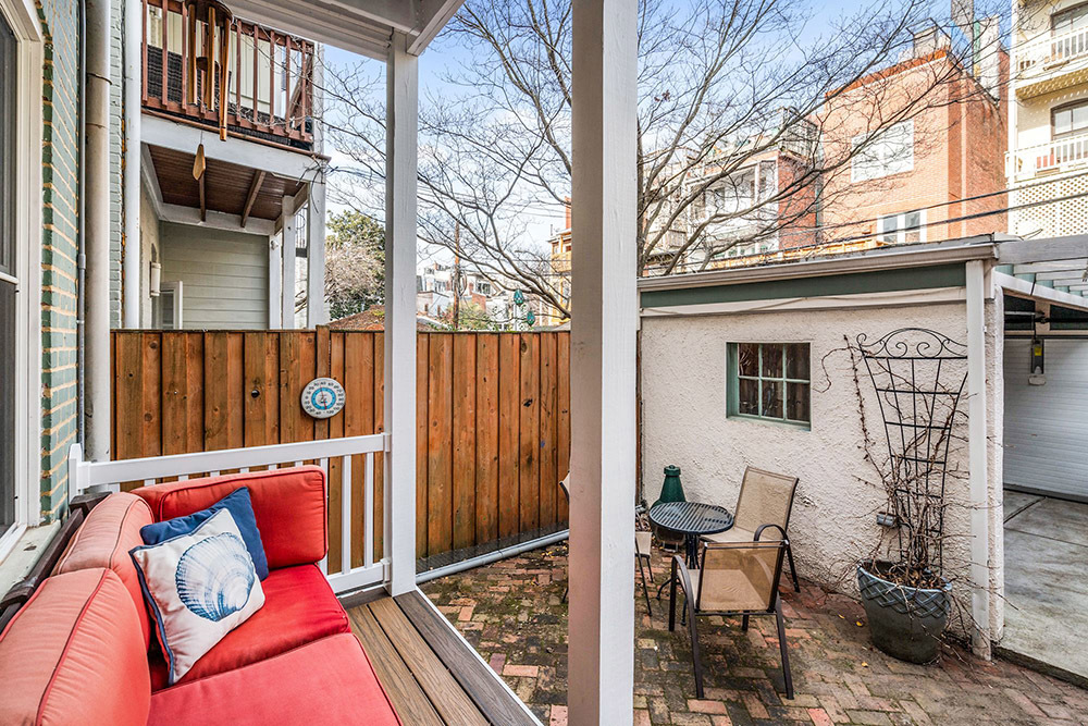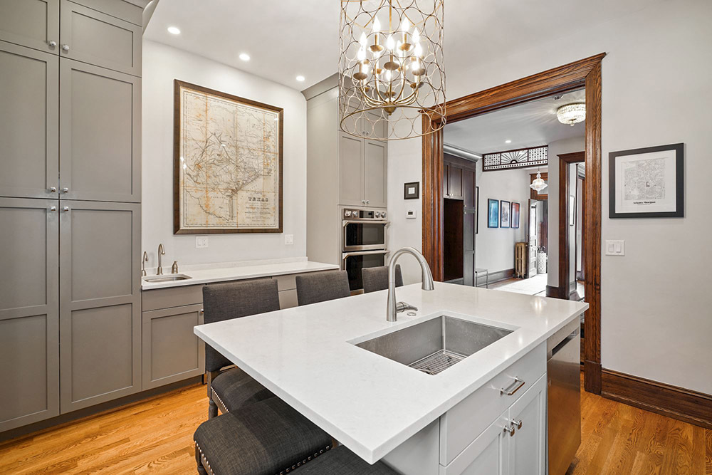 A completely remodeled and repositioned gourmet kitchen is the natural centerpiece of the home; a wonderful place to gather as culinary delights are created. Among the highlights are custom floor-to-ceiling cabinetry, two sinks and two kitchen workspaces, panelized upscale stainless steel appliances, stone counters and an island. A picturesque archway leads to the living room, with a wood and glass door opening to a charming covered porch, and a private back yard with brick patio and wooden fencing. It’s the perfect place for dining al fresco or simply relaxing. A private garage off the back alley has been nicely opened to the back yard for easy access.