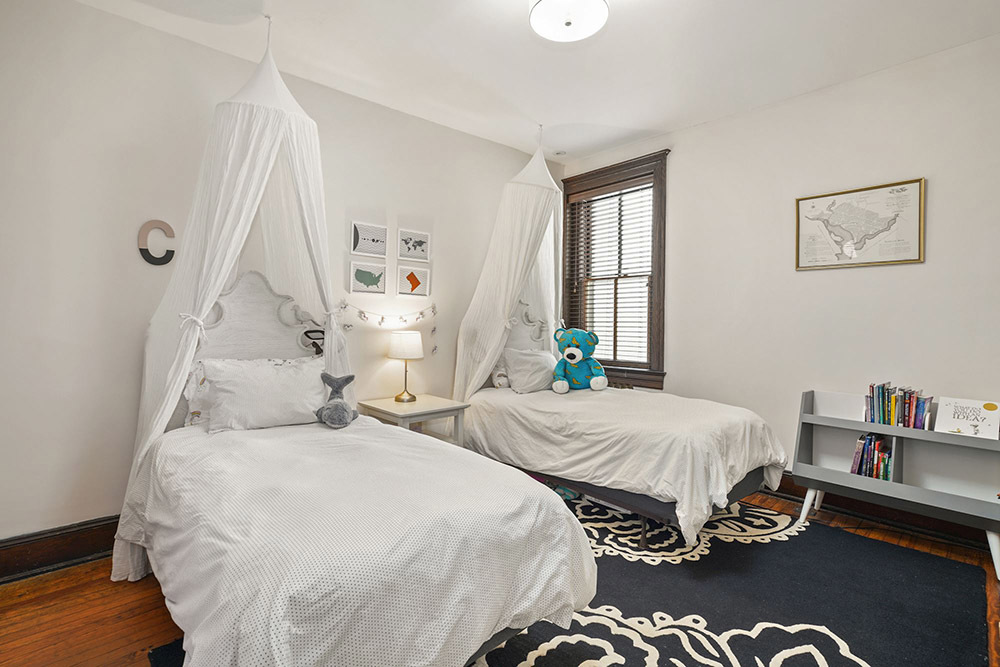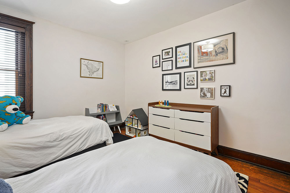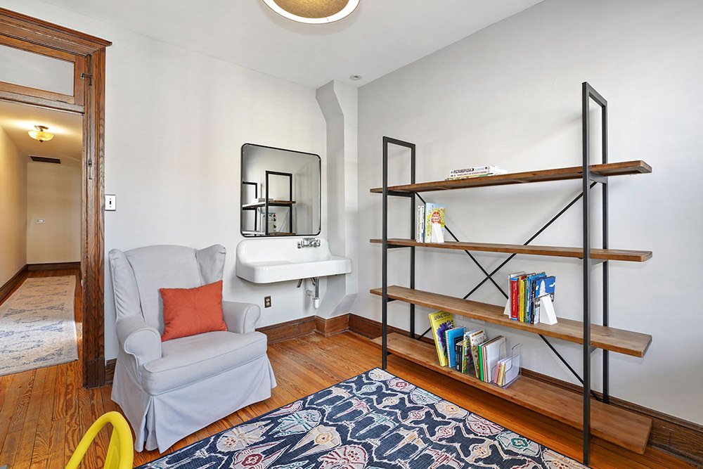 Private quarters are found on the top two stories. The second level features a huge family room with four windows, a front bay and a gorgeous fireplace and mantel. There’s two guest bedrooms, one of which includes a newly rebuilt balcony overlooking the back yard. The top level features a large owners’ bedroom with triple windows and fireplace, along with two more bedrooms. One of the bedrooms is currently used as a playroom, with a sink for fast and easy clean-up. All of the bathrooms throughout the home have been meticulously redone.