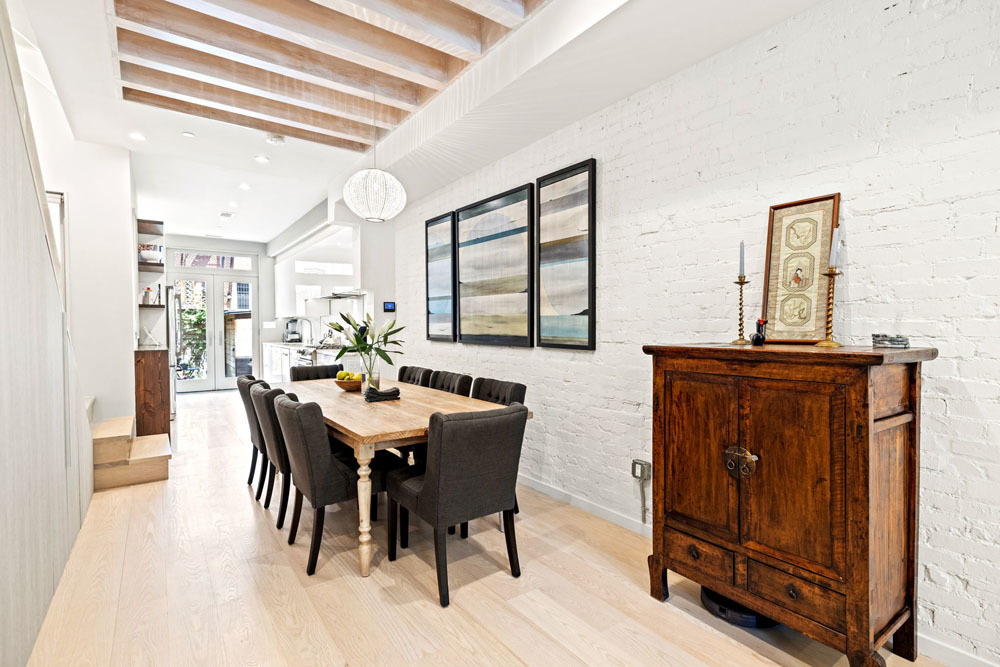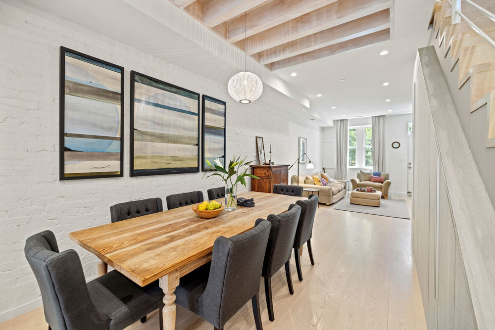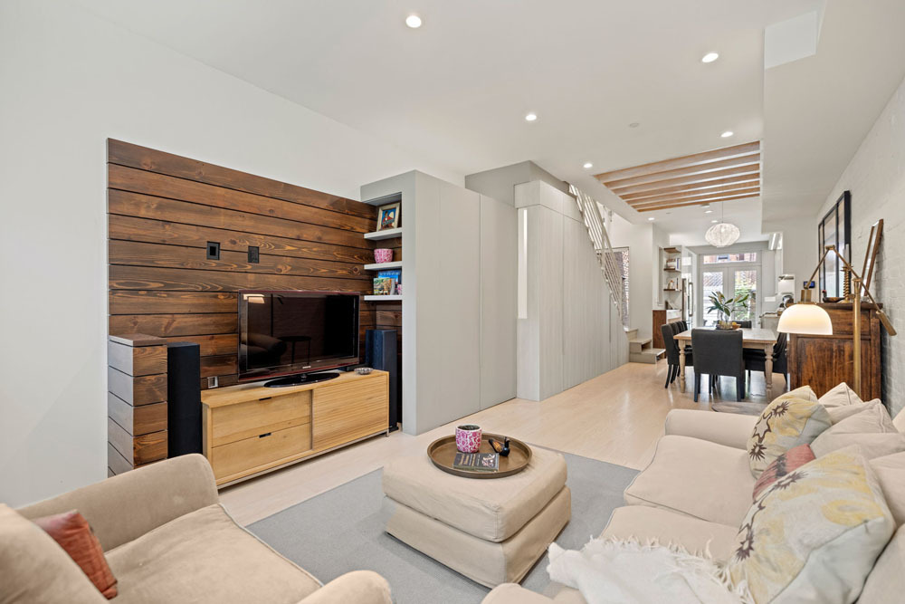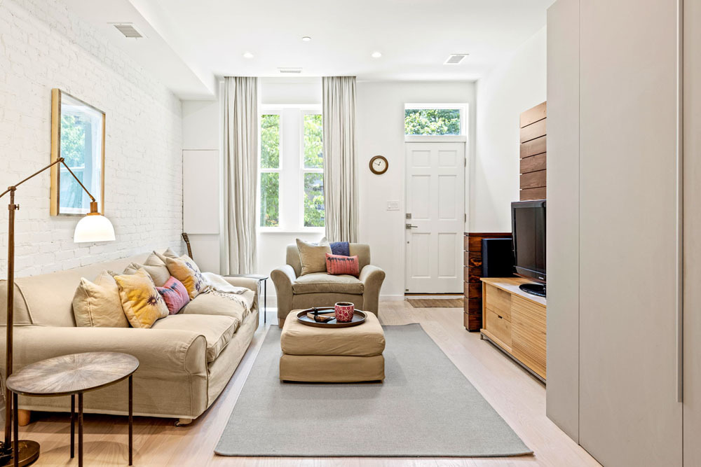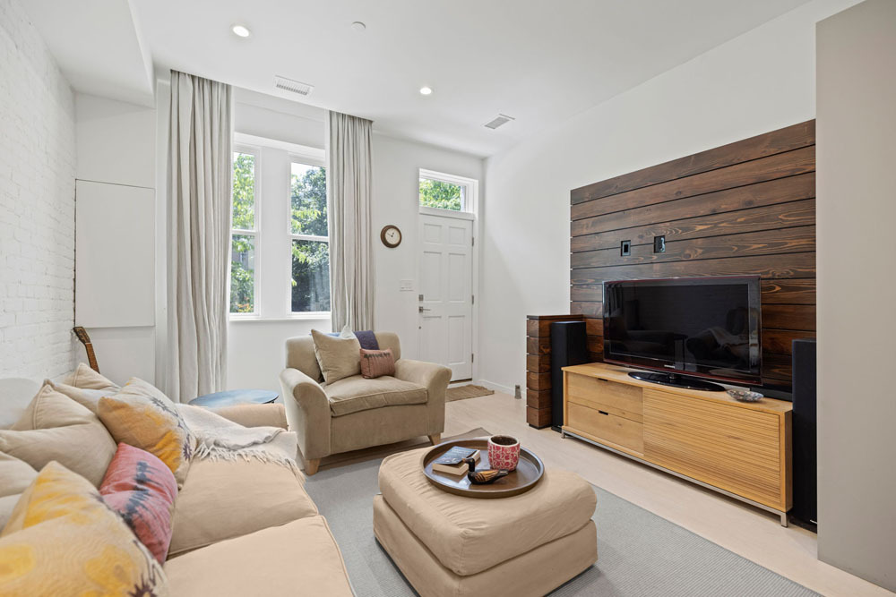 Located on a quiet, one-way street in historic Dupont Circle, this vintage rowhouse has been completely and thoughtfully transformed. The gut renovation and redesign from KUBE Architecture has brought the home fully into the present with whitewashed wooden floors throughout, huge windows, and open-space concepts. The main level of the south-facing home presents an extended living area with exposed white brick, a custom wooden entertainment nook, and recessed overhead lighting that complements the natural illumination.