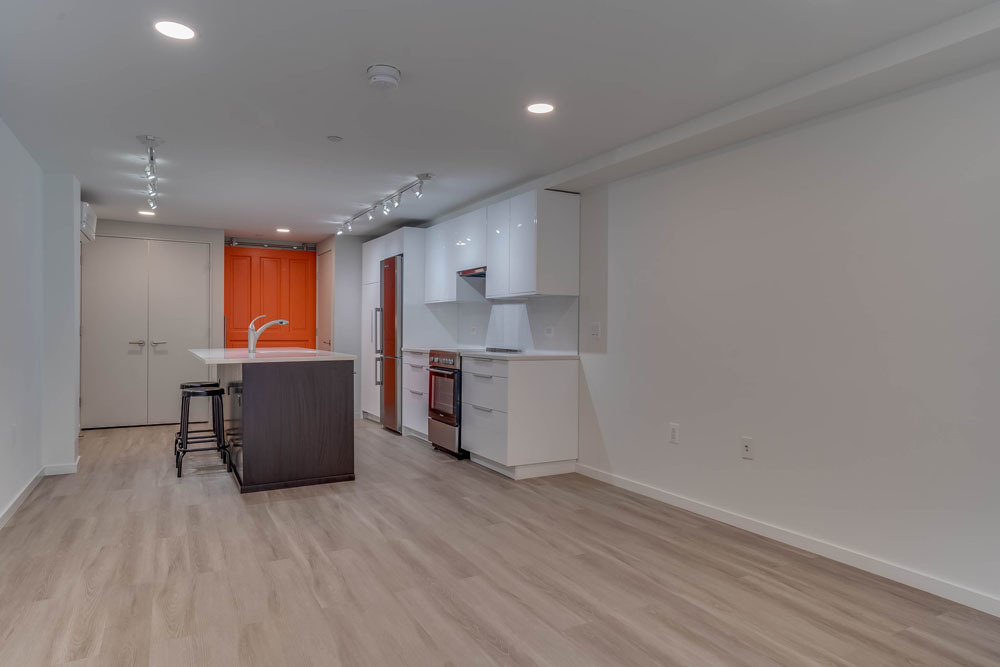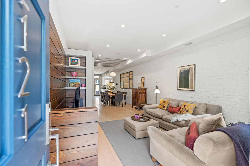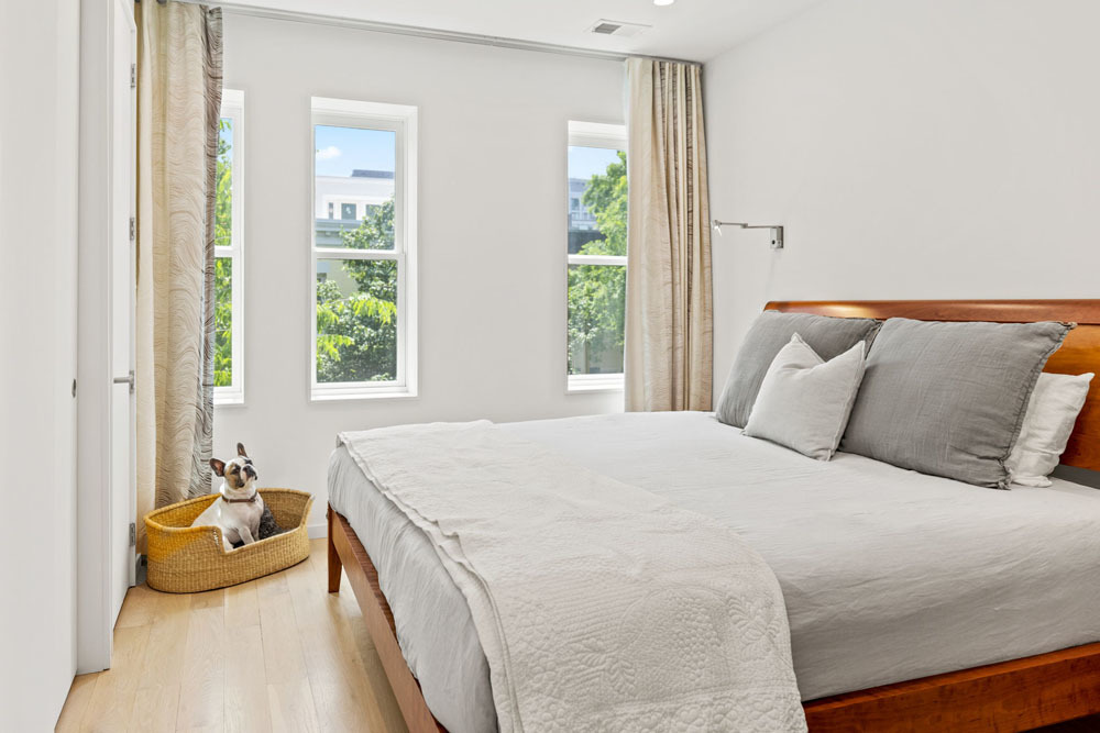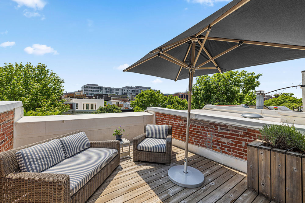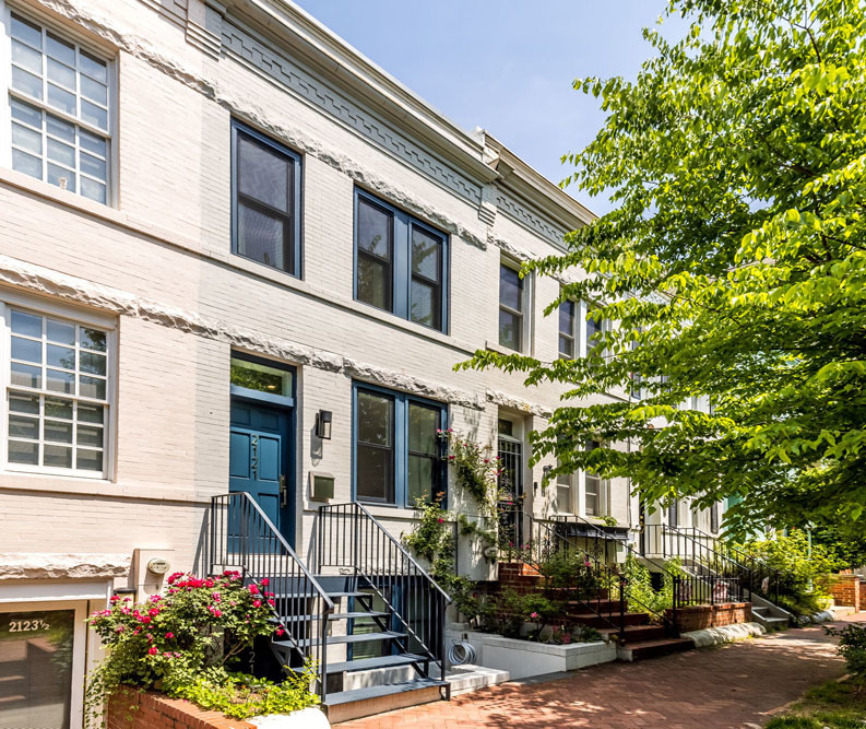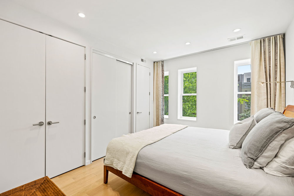 Located on a quiet, one-way street in historic Dupont Circle, this vintage rowhouse has been completely and thoughtfully transformed. The gut renovation and redesign from KUBE Architecture has brought the home fully into the present with whitewashed wooden floors throughout, huge windows, and open-space concepts. The main level of the south-facing home presents an extended living area with exposed white brick, a custom wooden entertainment nook, and recessed overhead lighting that complements the natural illumination.
