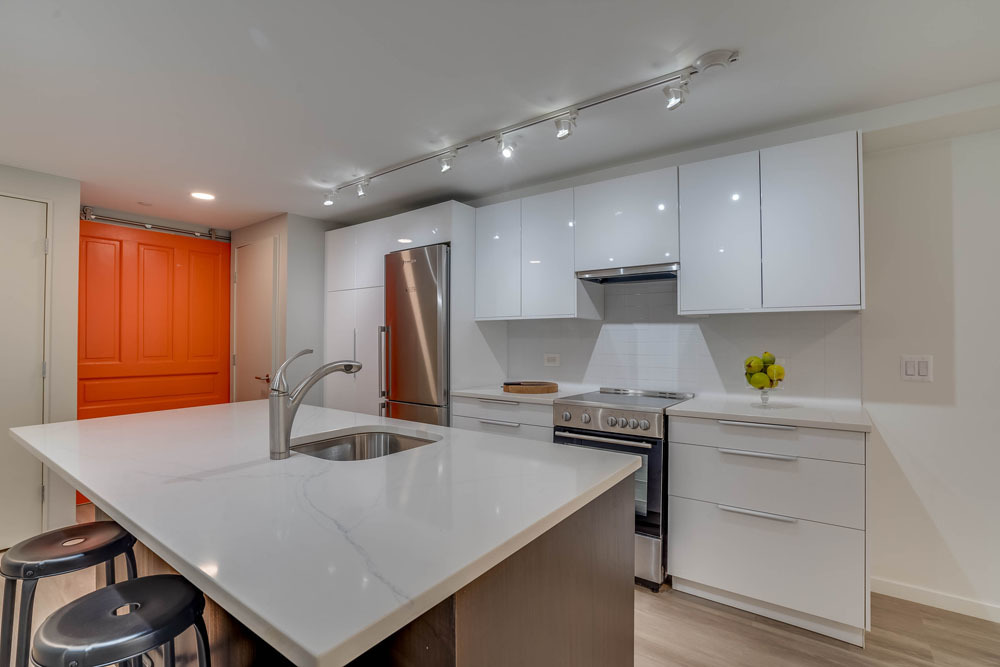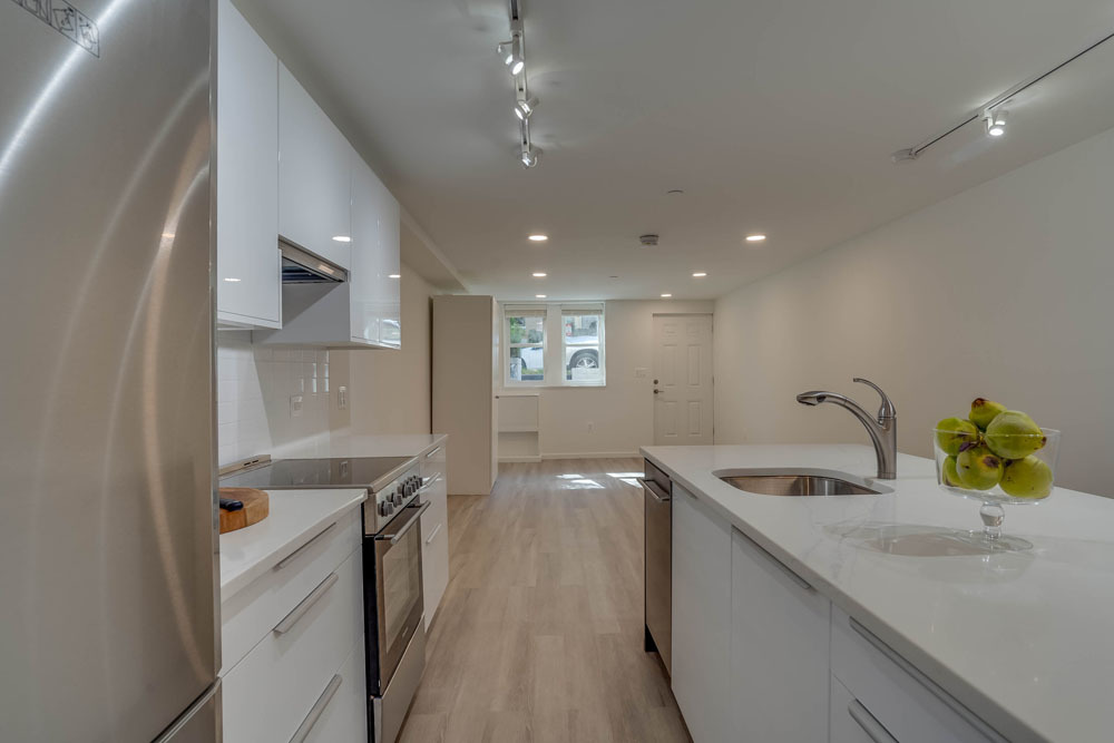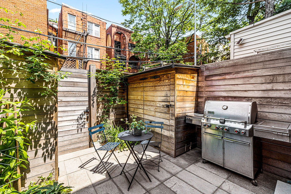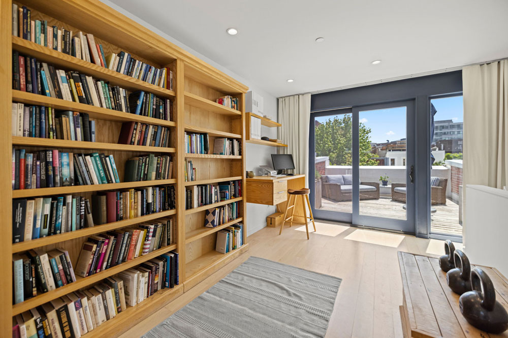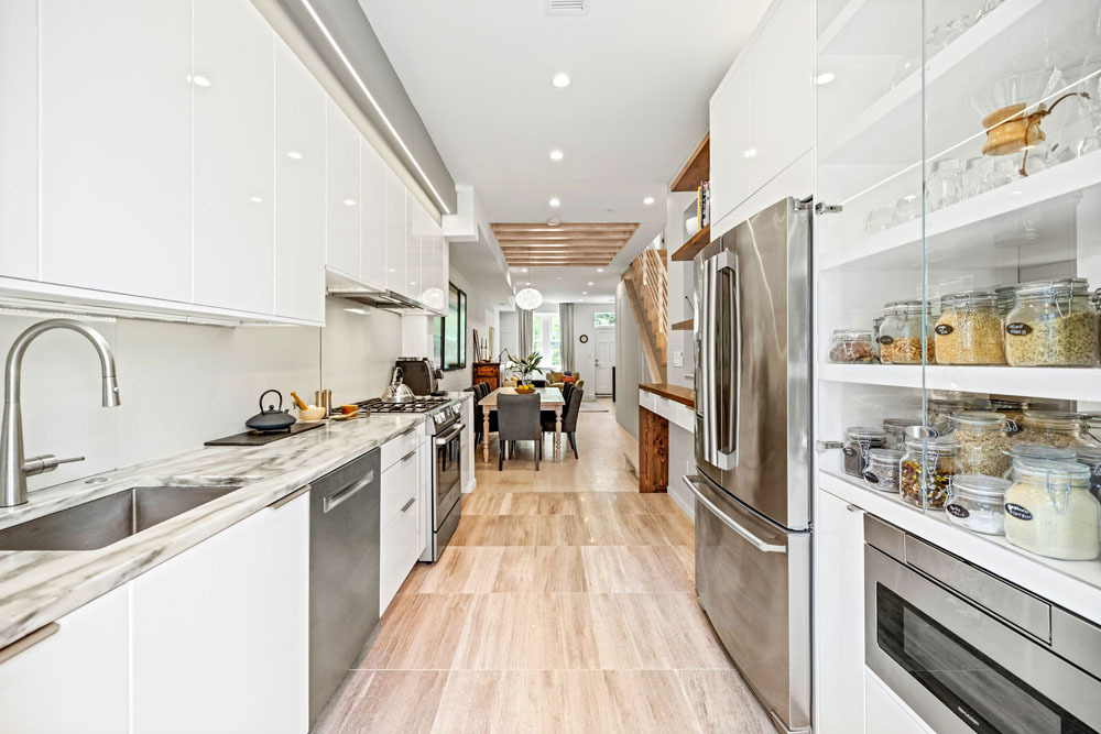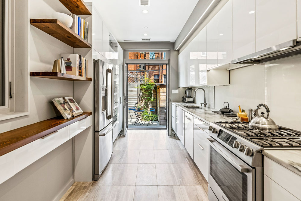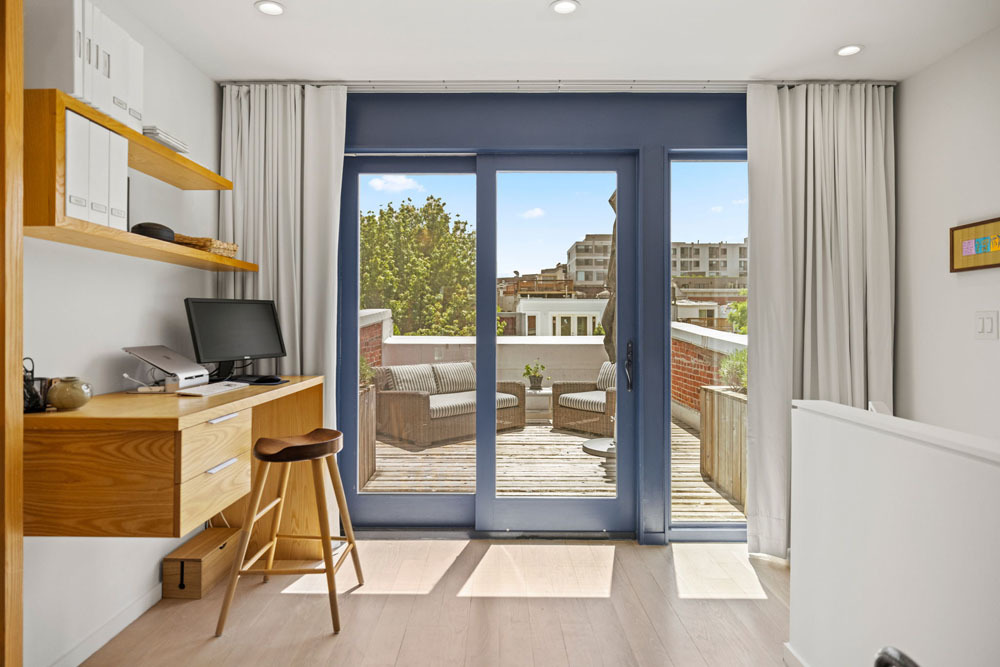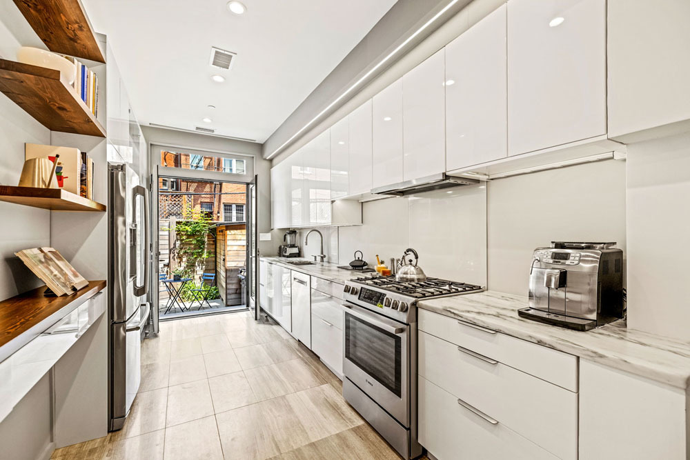 An incredible open workspace is at the very top, with a giant window wall at one end, full-height bookcases, and two built-in desks for both seating standing options. Step outside to an exquisite wooden roof deck with planters, the perfect place to unwind or brainstorm outside of the box. The lowest level was also redesigned by KUBE, resulting in a sleek studio apartment complete with a certificate of occupancy. This light-filled space includes a gorgeous open kitchen with glossy white cabinetry and stainless-steel appliances, a full bath, and private entrance, and is ideal for rental income or guest quarters.