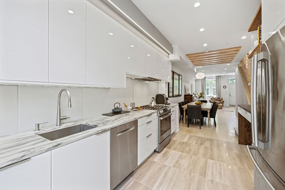 The dining area has a coffered ceiling and Arturo Alvarez designed lighting. A powder room with marble floor and Duravit cabinetry is cleverly hidden under the stairs. The open cook’s kitchen is a stunning showcase with white high gloss cabinetry, marble floors and countertop, glass doored feature cabinet, tempered-glass backsplashes, under-cabinet lighting, and high-end stainless-steel appliances. French doors lead out to an enchanting rear patio with an outdoor kitchen, bluestone flooring, and cedar horizontal fencing.