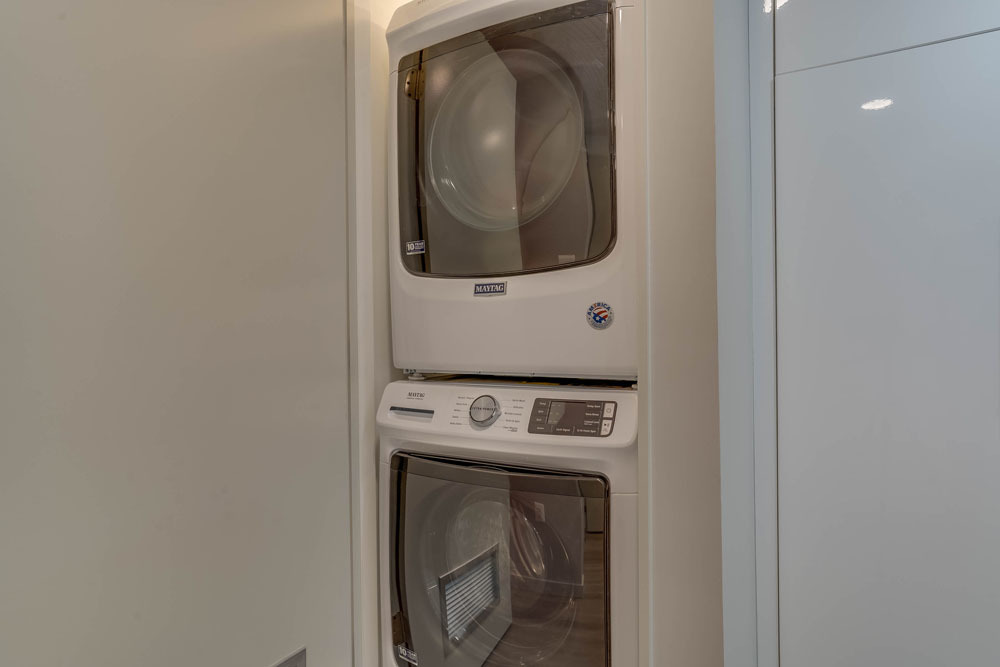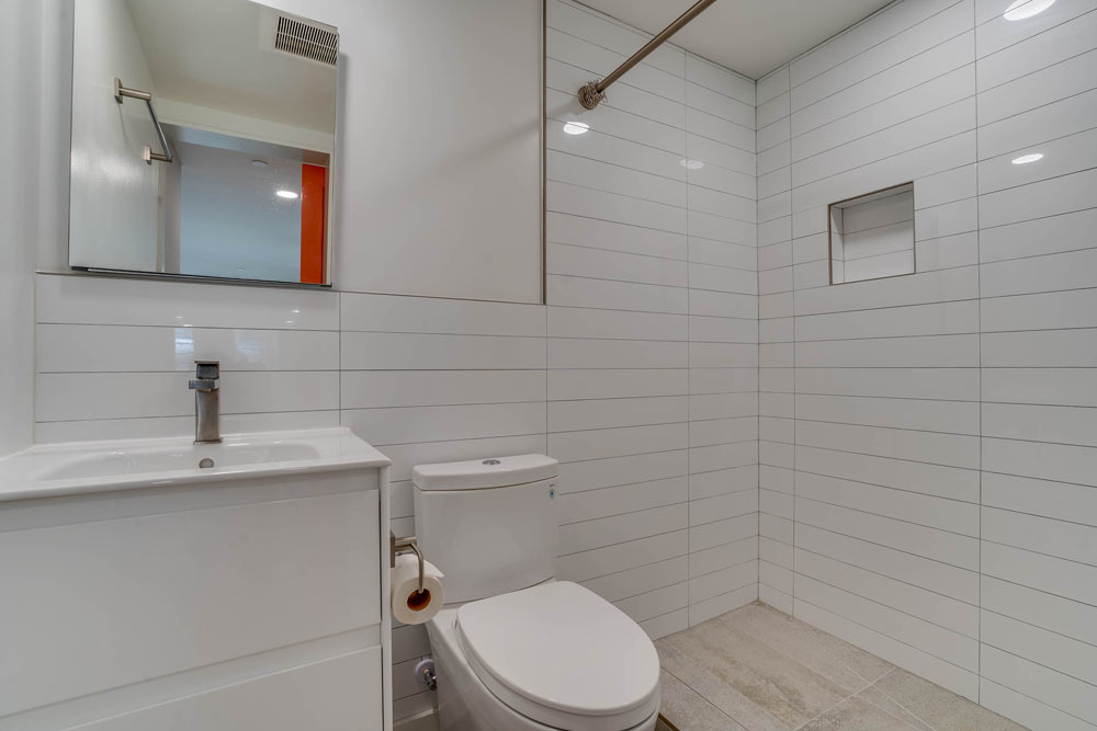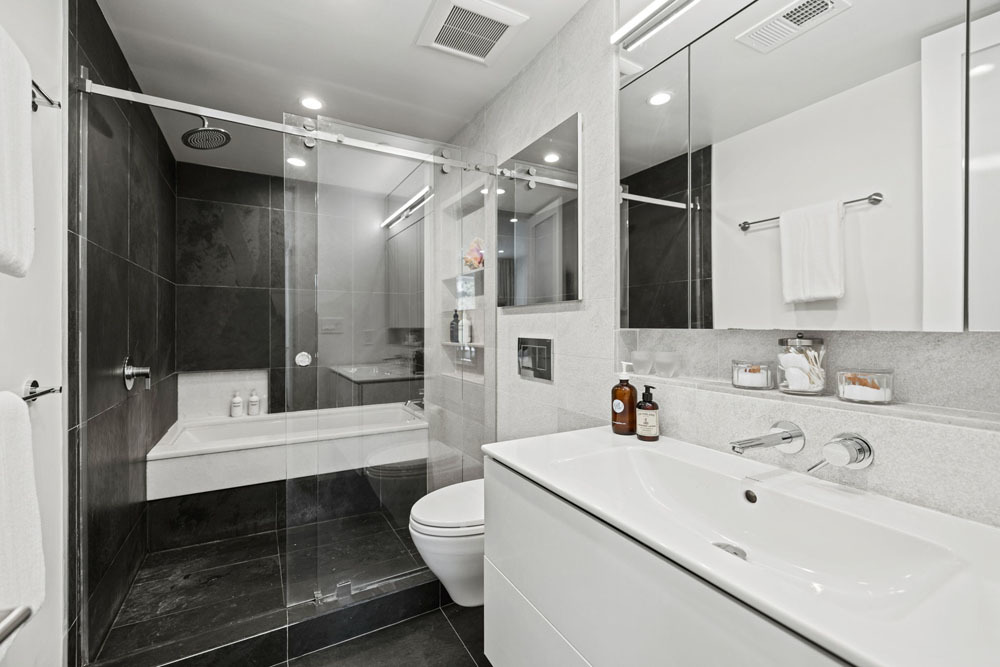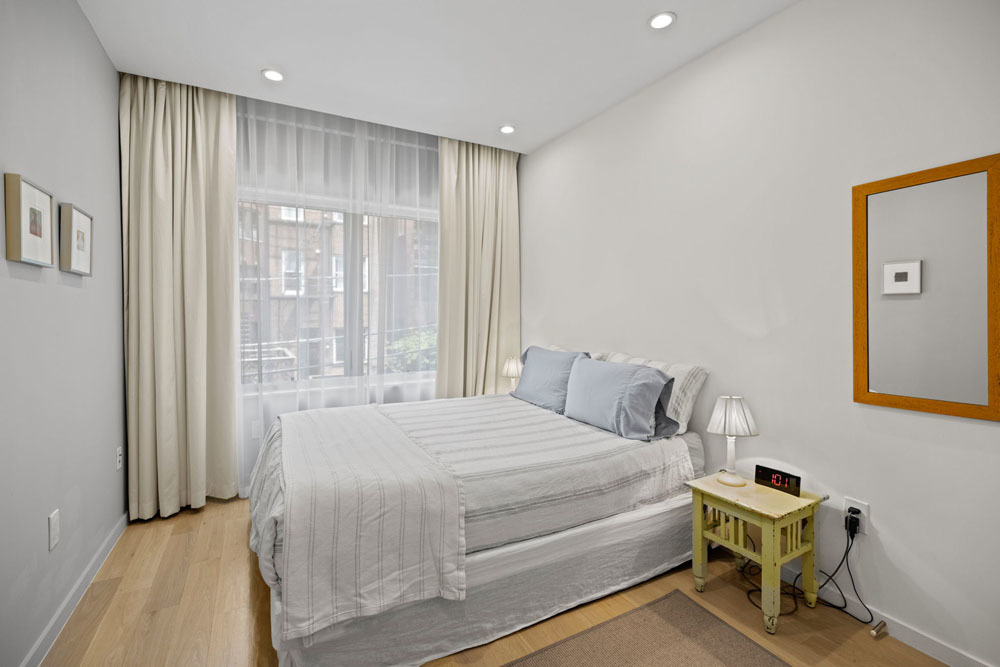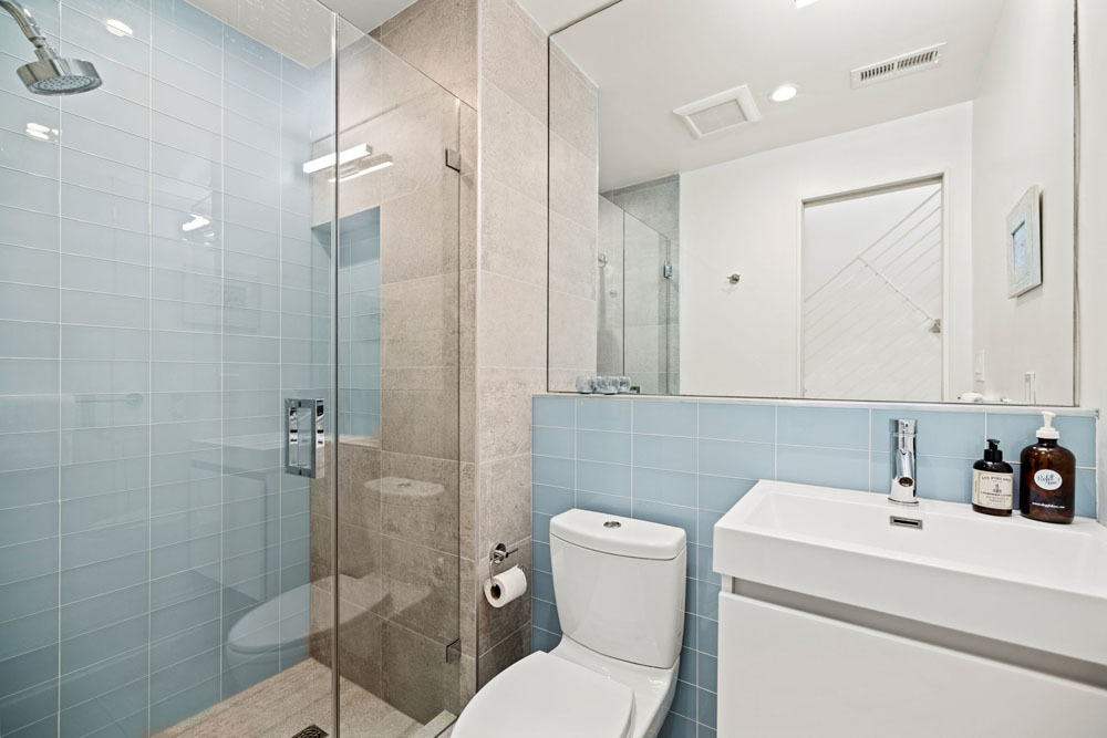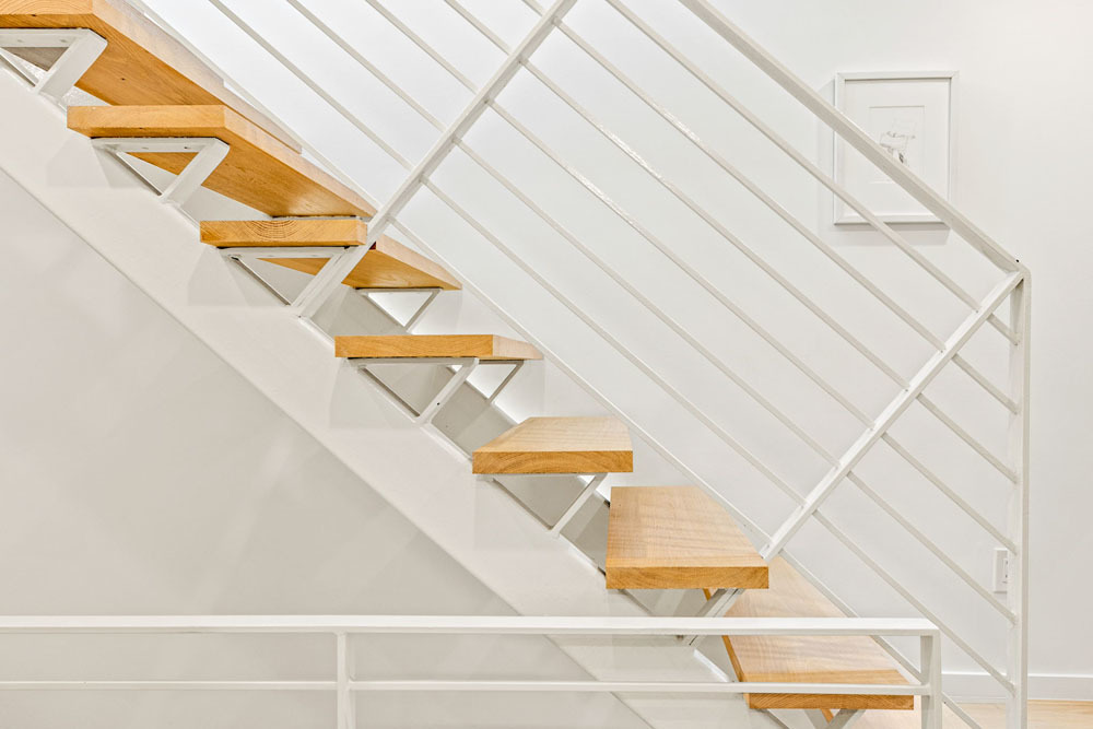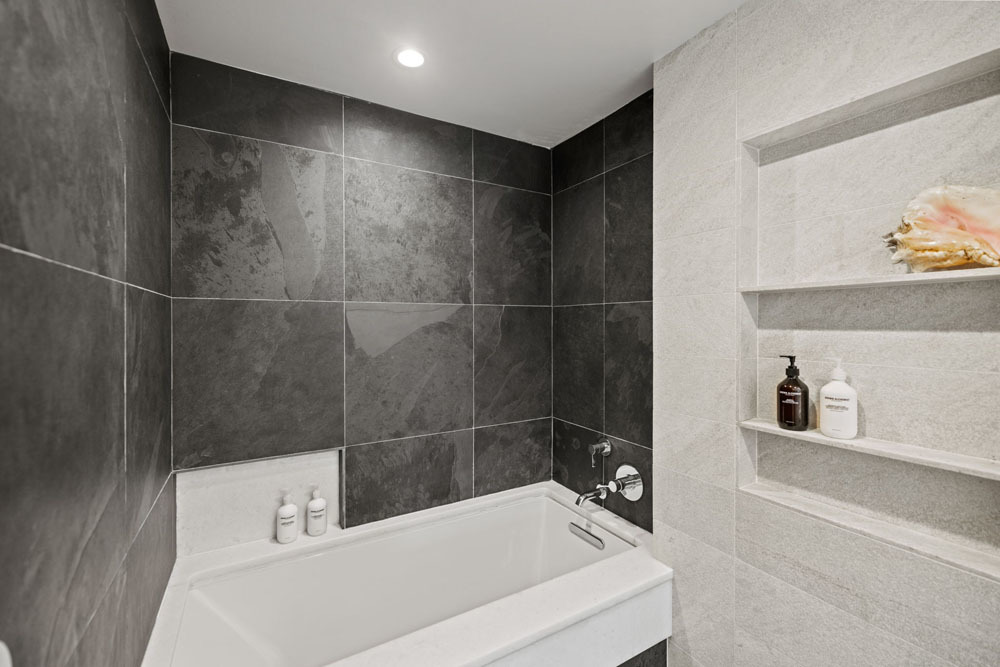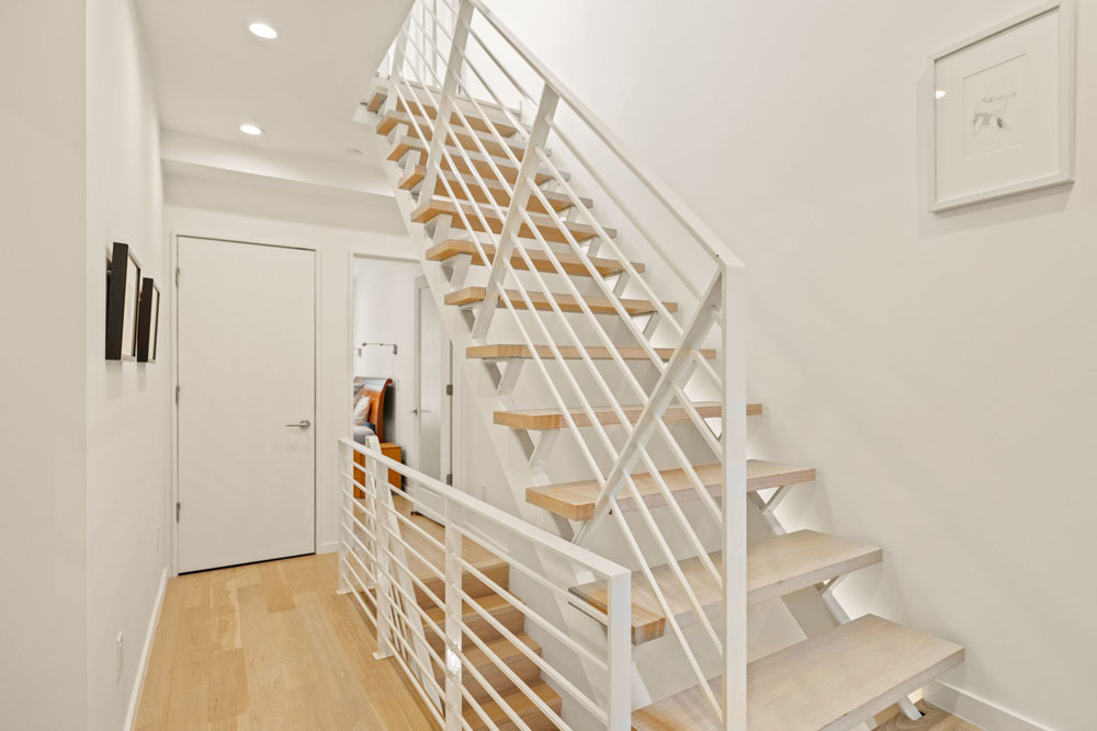 Stunning modernist stairs ascend to private quarters, with frosted glass bedroom doors allowing natural light to spread seamlessly. A splendid primary suite boasts triple windows, lots of closet space, and Contardi Manhattan swing-arm wall sconces. The remodeled ensuite bath features slate floors and walls, Duravit cabinetry, white quartz vanity, and a remarkable glass door wet room with shower, soaking tub, and Graff fixtures. A second bedroom is at the opposite end, along with a remodeled bath featuring a frameless shower and glass tile.